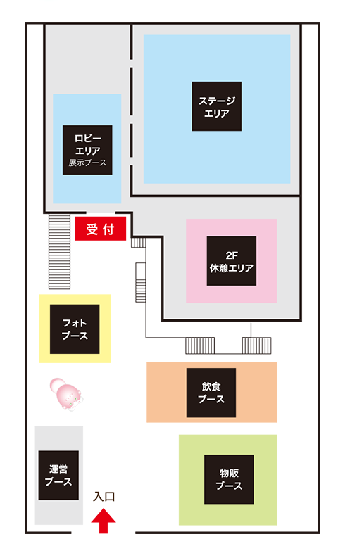 - ステージ、展示ブース、フォトブース、グッズ販売、フードコーナー