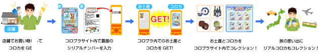 「コロカ」は、店舗ごとに異なるデザインのプラスチック製カードで、金額に応じて3種類あり、「コロニーな生活」のゲーム内で入力するとその店舗限定の特別アイテムの購入権利が得られるシリアル番号が裏面に印刷されています。コロカを入手するには、導入店舗の店頭へ出向き、所定の金額分の商品を購入しなければならないため、ゲーム内特別アイテムという"バーチャル"が「コロカ」や人の移動という"リアル"と上手く連動する仕組みになっており、ゲームユーザーの来店・購入の促進につながっています。ゲーム内の画面には、コロカ導入店舗の歴史や製品、ものづくりへの思いなど、取材記事風の詳細な説明が写真付きで掲載されるため、ユーザーに事前に店舗や商品に関する詳細な情報を伝えることができます。また、コロカは訪問の記念としてユーザーの手元に残るため、各社の商品やブランドを永続的に訴求するのにも役立っています。