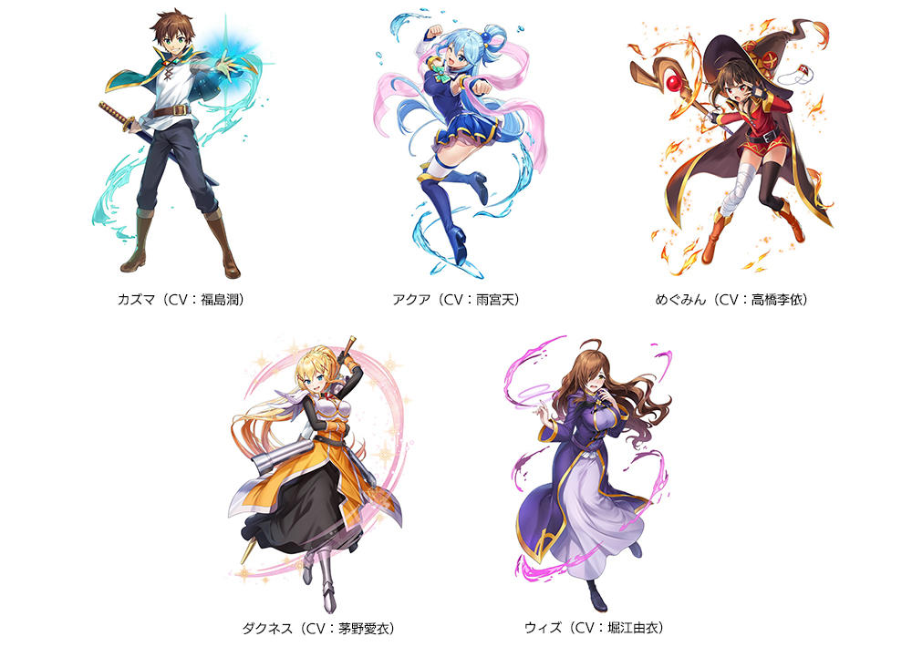 また、コラボキャラガチャも登場いたします。イベントに登場する「カズマ(CV:福島潤)」、「アクア(CV:雨宮天)」、「めぐみん(CV:高橋李依)」、「ダクネス(CV:茅野愛衣)」、「ウィズ(CV:堀江由衣)」を仲間にできます。さらに、コラボキャラのスキル覚醒Lv上限解放や武器の神進化を行いました。