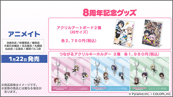 対象のアニメイト店舗にて、各種8周年記念グッズが販売中!