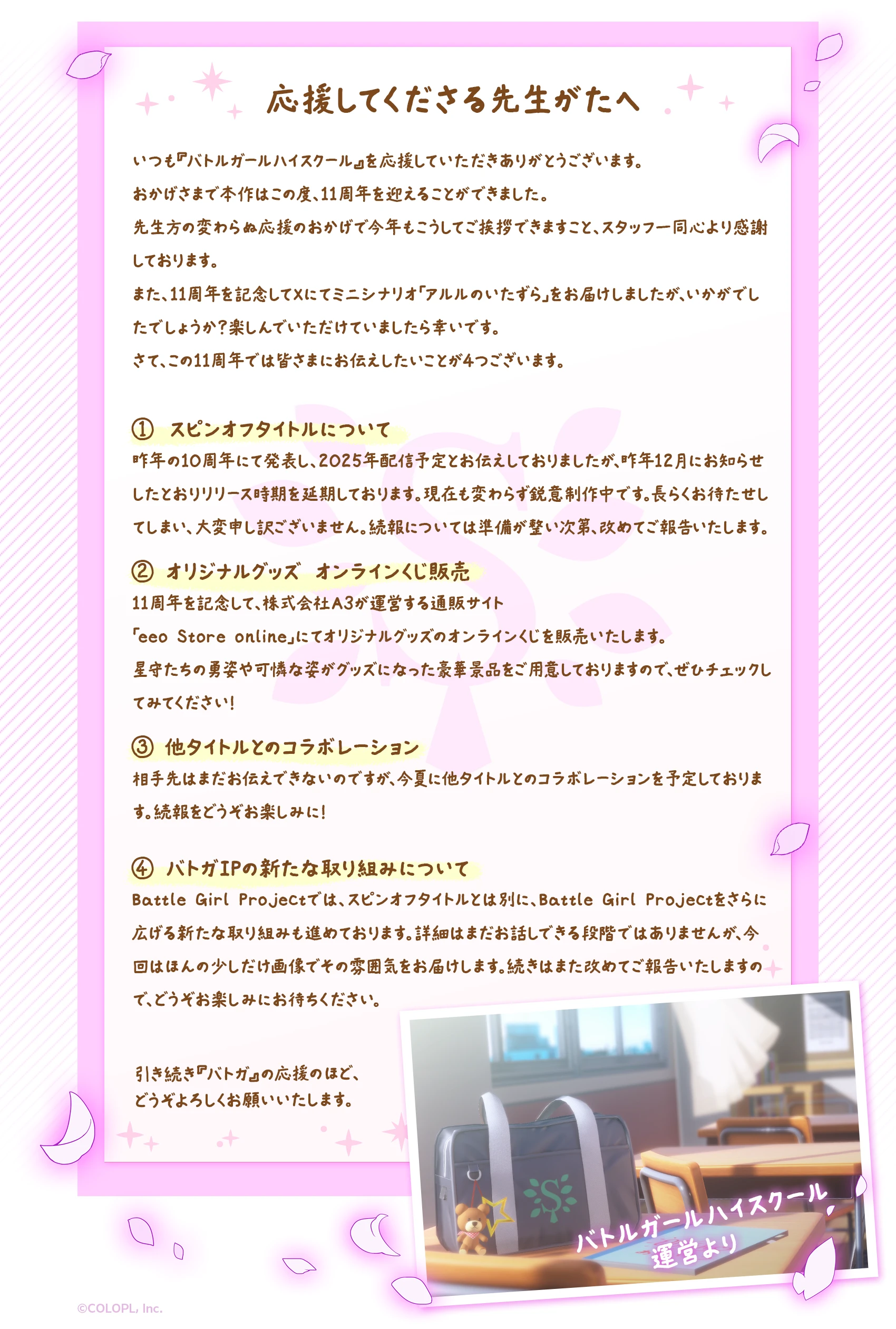 応援してくださる先生方へ いつも『バトルガールハイスクール』を応援していただきありがとうございます。 おかげさまで本作はこの度、11周年を迎えることができました。 運営より皆様へのメッセージを用意しました。ご覧ください。