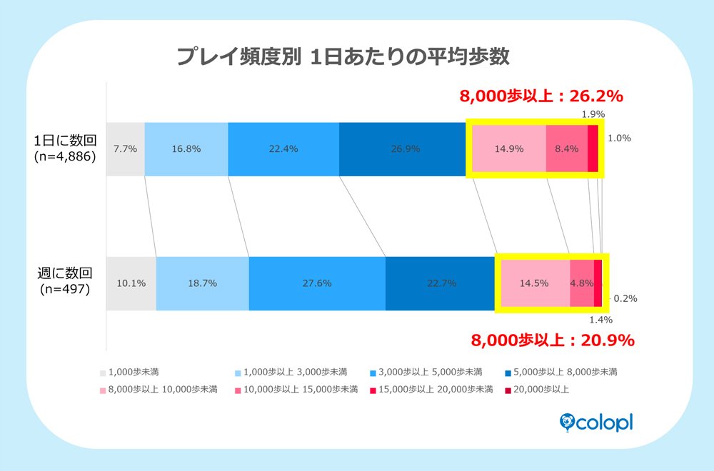 - プレイ頻度と歩数の関係:頻度が高いほど「8,000歩以上」の割合が上昇