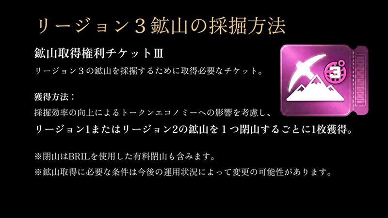 また、このチケットを用いることでしか、リージョン3の鉱山は取得・採掘できません。