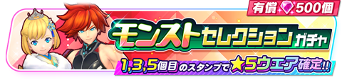 『モンスト』からはアーサー(CV:秋山絵理)、エクスカリバー(CV:小西克幸)の2キャラクターのみ、『白猫プロジェクト NEW WORLD'S』からはオスクロル(CV:茅野愛衣)、シャナオウ(CV:福山潤)の2キャラクターのみの★5ウェアが登場するガチャを開催予定です。本ガチャは有償ジュエル500個限定で5回までまわすことができ、1回目、3回目、5回目のスタンプでは★5ウェアが確定となります。それぞれのキャラクターは限定ウェアも登場します。