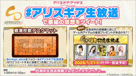 1月21日(水)に行われた「8周年記念生放送」の感想をTwitterに投稿することで、花浪や絵伝たちが通う「郷湾育英高等学校」の校歌額をイメージした特製デスクマットを、抽選で1名様にプレゼントいたします。アリスギアの公式Twitterをフォローしたうえで、ハッシュタグ「#アリスギア生放送」をつけて番組の感想をツイートすると応募完了となります。