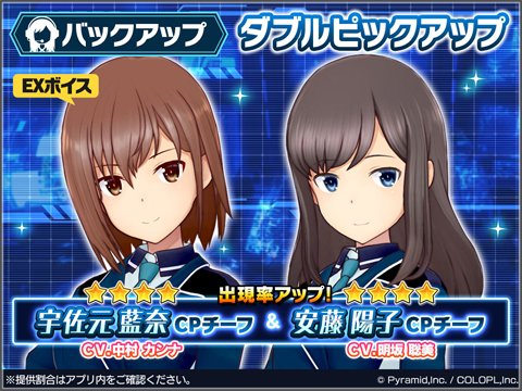 βテスト版の公開にあわせて、バックアップ★4キャラ「宇佐元 藍奈【CPチーフ】(CV:中村 カンナ)」と「安藤 陽子【CPチーフ】(CV:明坂 聡美)」をピックアップしたスカウトが開催中です。