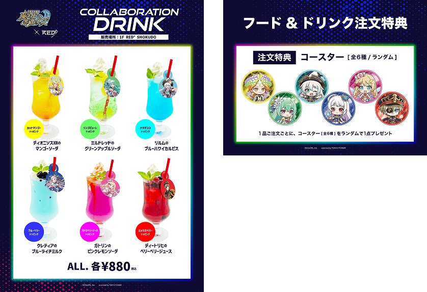 1F「RED° SHOKUDO」ではコラボカフェをお楽しみいただけます。こちらでは、キャラクターを表現したコラボドリンクやフードメニューをお楽しみいただけます。1品ご注文ごとに、コースター(全6種)をランダムで1枚プレゼントします。フードメニューの詳細については続報をお待ちください。