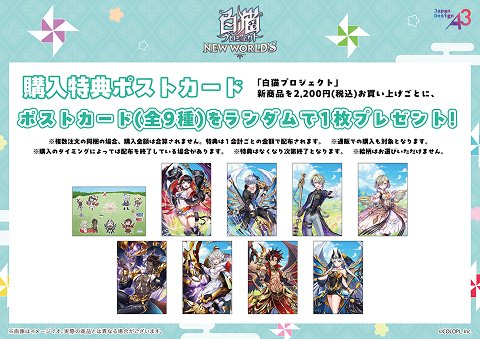 購入特典として、1回のご注文で対象商品を2,200円(税込)ご購入ごとに、キャラクター8名の公式イラスト、もしくは今回の新規作成グラフアートを使用したビジュアルのポストカード(全9種)のうち、いずれか1枚をランダムでプレゼントいたします。詳細は特設ページをご確認ください。