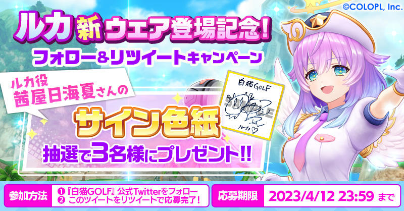 「ルカ(CV:茜屋 日海夏)」の新ウェア登場を記念して、「ルカ」のキャラクターボイスを担当する茜屋 日海夏さんの「サイン色紙」が抽選で3名様に当たる「フォロー&リツイートキャンペーン」を開催中です。『白猫GOLF』公式Twitterをフォローして、対象のツイートをリツイートすることで応募完了となりますので、ぜひ奮ってご参加ください。