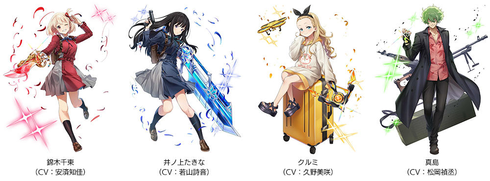 特設サイトでは、本コラボイベントに登場する「錦木千束(CV:安済知佳)」「井ノ上たきな(CV:若山詩音)」「クルミ(CV:久野美咲)」「真島(CV:松岡禎丞)」のイラストを公開しております。